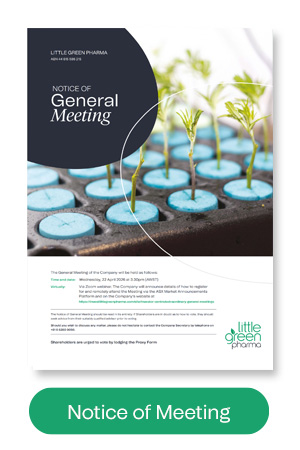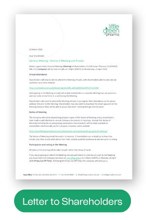 Little Green Pharma Ltd (LGP or the Company) wishes to advise shareholders it will hold an extraordinary general meeting on Wednesday, 22 April 2026 at 3.30pm (AWST) (Meeting). The Meeting has been convened to seek shareholder approval of the resolutions contained in the Notice of Meeting (see link above). Shareholders should read the Notice of Meeting carefully before deciding how to vote on the resolutions.